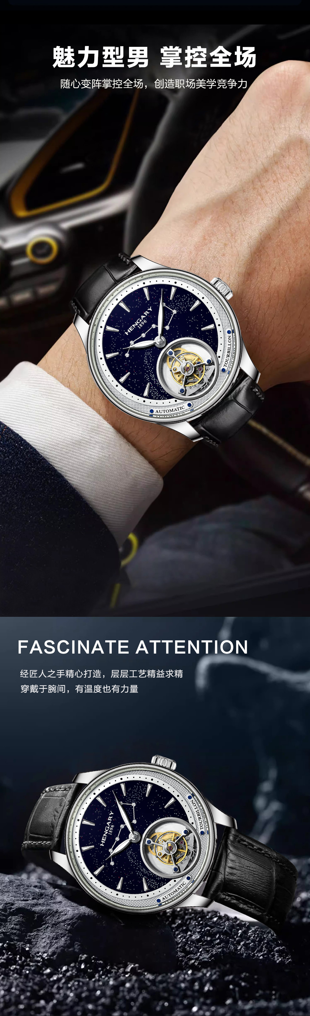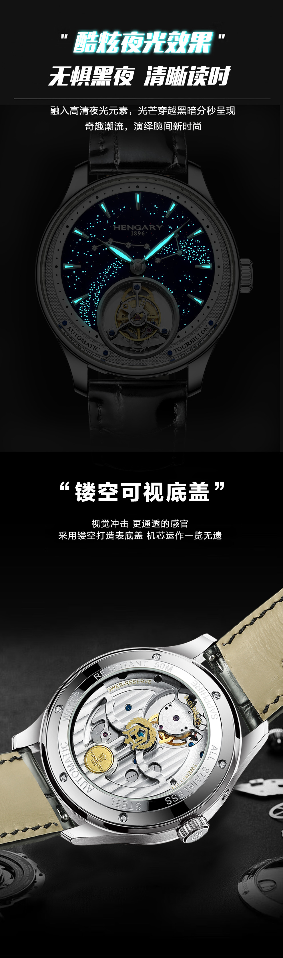 🌌 双境夜光奇境—— 专利星空夜光表盘搭配全刻度Super-LumiNova荧光涂层,暗夜中如置身浩瀚星野,指针与陀飞轮框架同步生辉,实现「读时即观星」的沉浸体验。