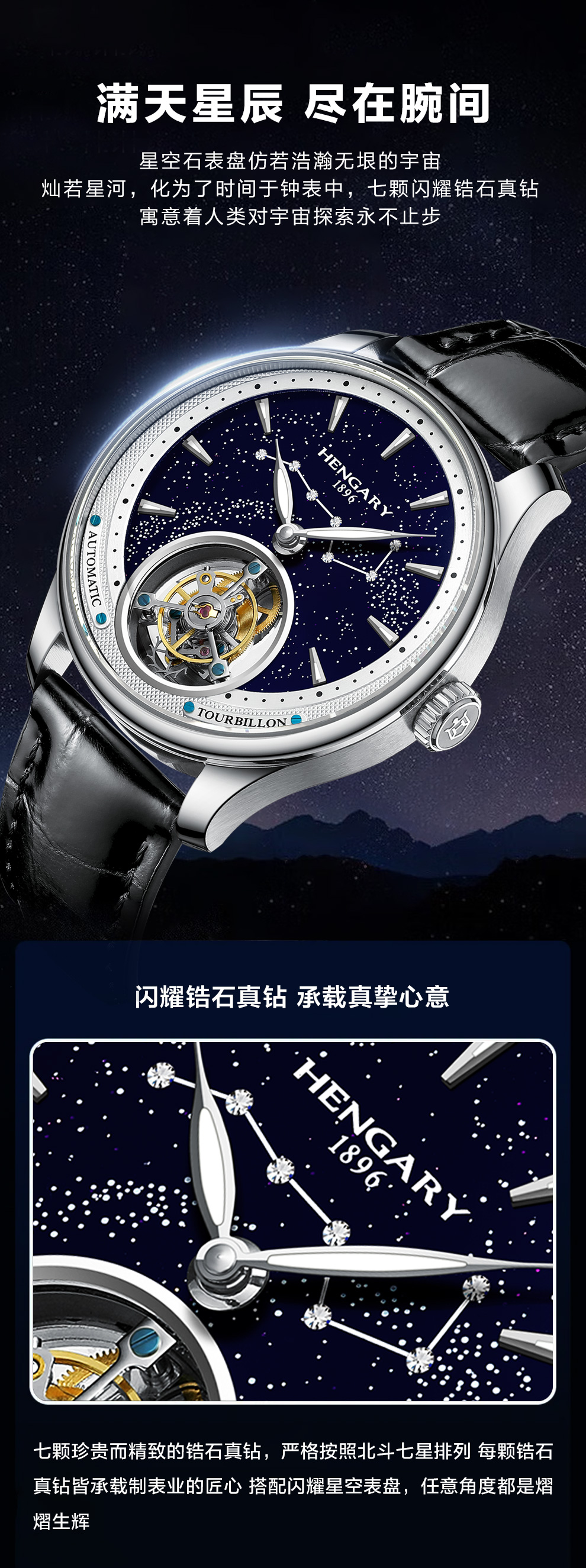 ✨ 苍穹镌刻于腕间 —— 7颗顶级锆石真钻以北斗七星天象精密排布,每一颗均经瑞士切割工艺雕琢,折射如银河倾泻的璀璨光华。